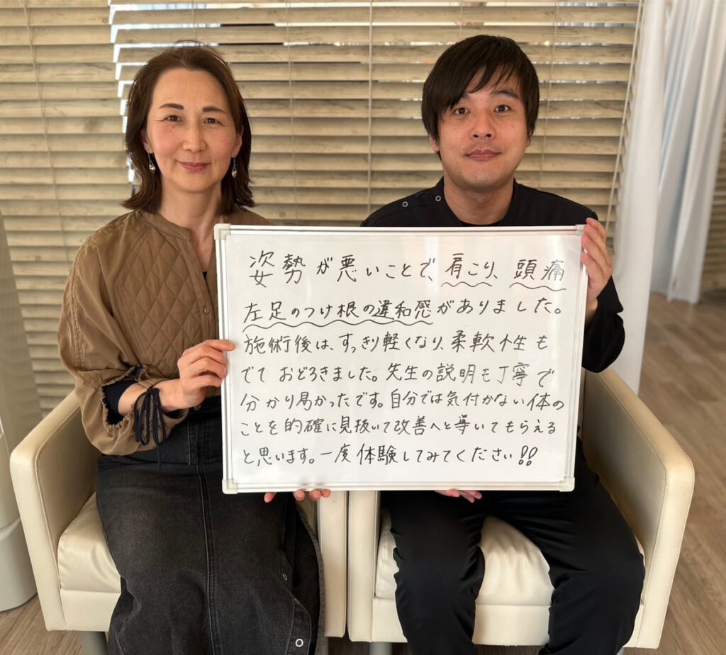 カウンセリングの段階から姿勢が歪んでいることが分かり、施術を受けた後には、すっきり身体が軽くなって、姿勢もびっくりするほど正しい形に治っていました。