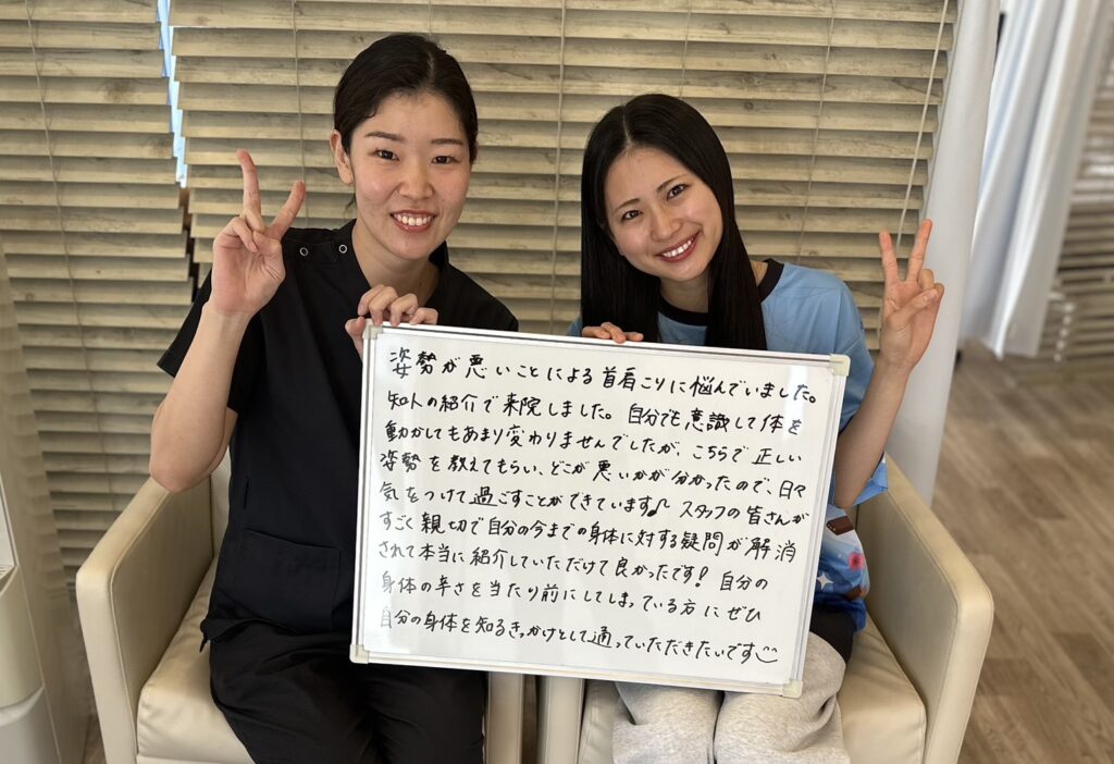 知人の紹介で来院しました。自分でも意識して体を動かしてもあまり変わりませんでしたが、こちらで正しい姿勢を教えてもらい、どこが悪いかが分かったので、日々気をつけて過ごすことができています♪スタッフの皆さんがすごく親切で、自分の今までの身体に対する疑問が解消されて本当に紹介していただけて良かったです!自分の身体の辛さを当たり前にしてしまっている方にぜひ自分の身体を知るきっかけとして通っていただきたいです^^