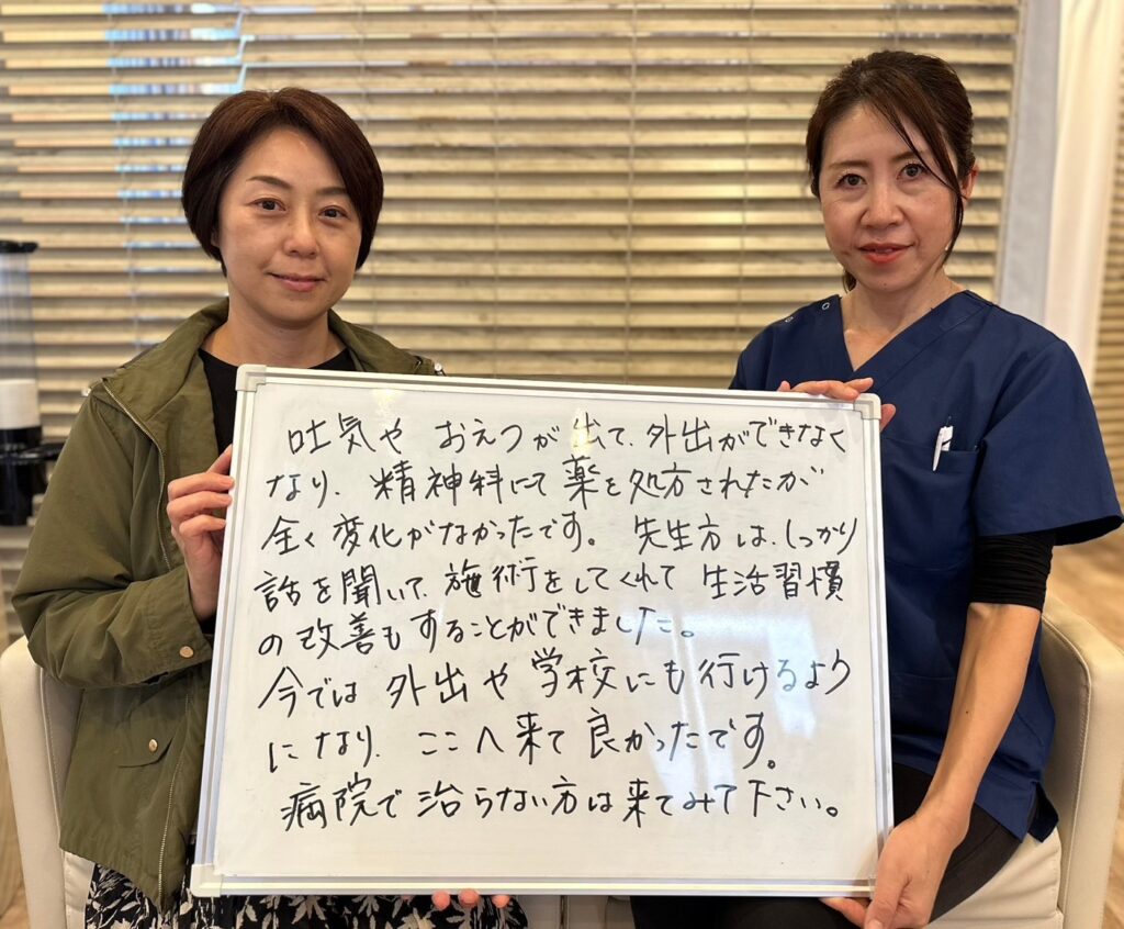 子供が吐気やおえつが出て、外出ができなくなり、精神科にて薬を処方されましたが全く変化がありませんでした。