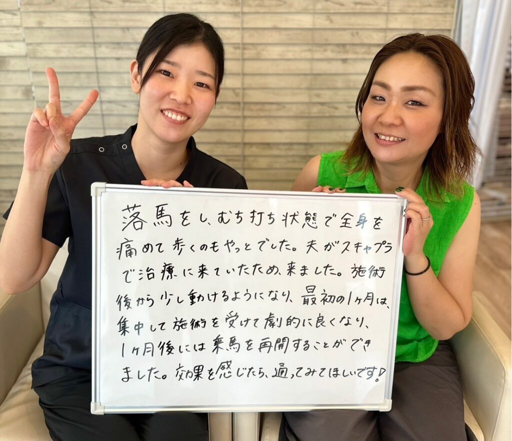 乗馬中に落馬して、むち打ち状態で全身を痛めて歩くのもやっとでした。
