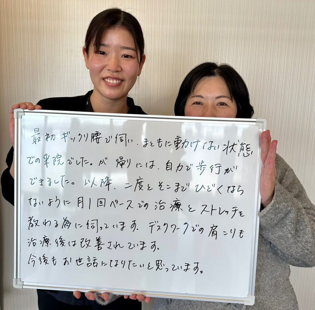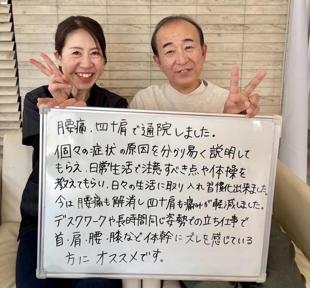 今までギックリ腰をくり返していましたが、こちらに通うようになり腰痛が改善されました。また、自分の身体の状態が分かるようになり、生活のリズムが整いました。