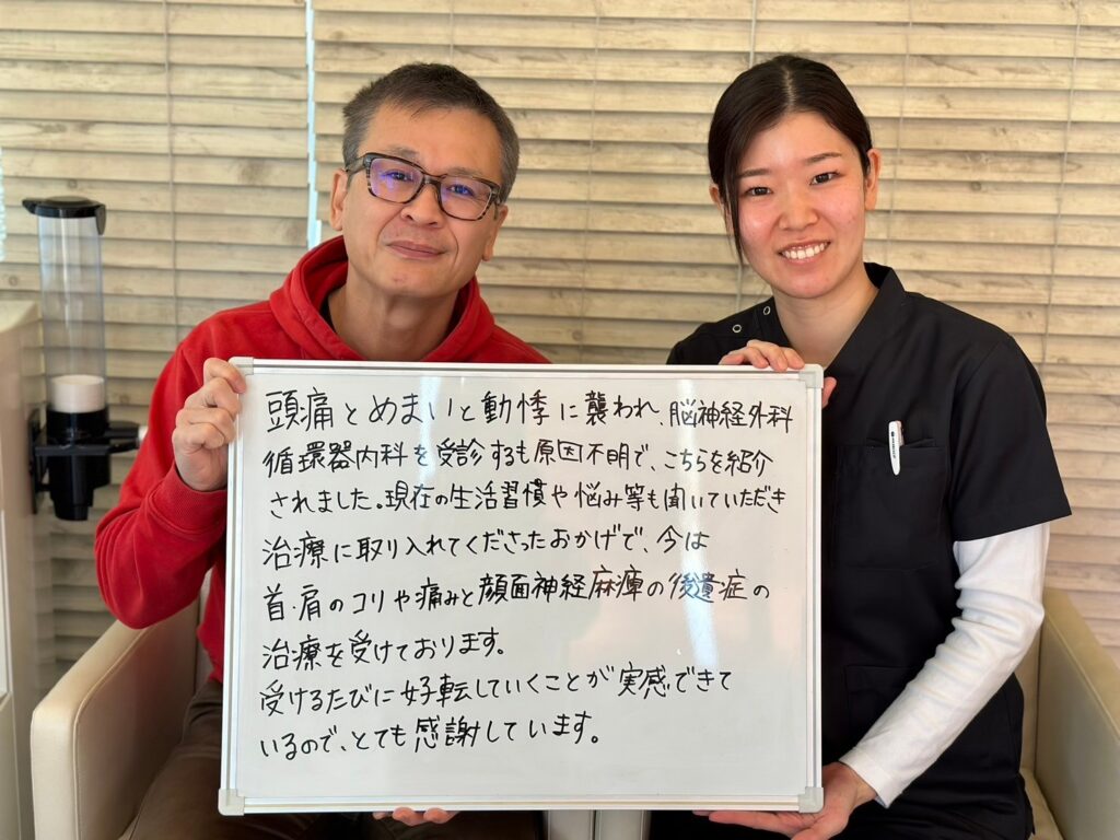 現在の生活習慣や悩み等も聞いていただき、治療に取り入れてくださったおかげで、今は首肩のコリや痛みと顔面神経麻痺の症状の治療を受けております。