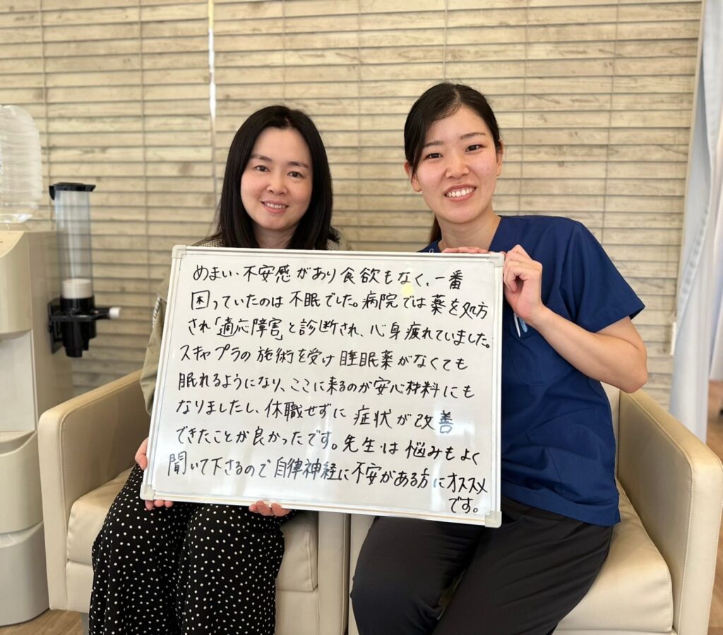 こちらの施術を受け、睡眠薬がなくても眠れるようになり、ここに来るのが安心材料にもなりました。また、休職せずに症状が改善できたことが良かったです。