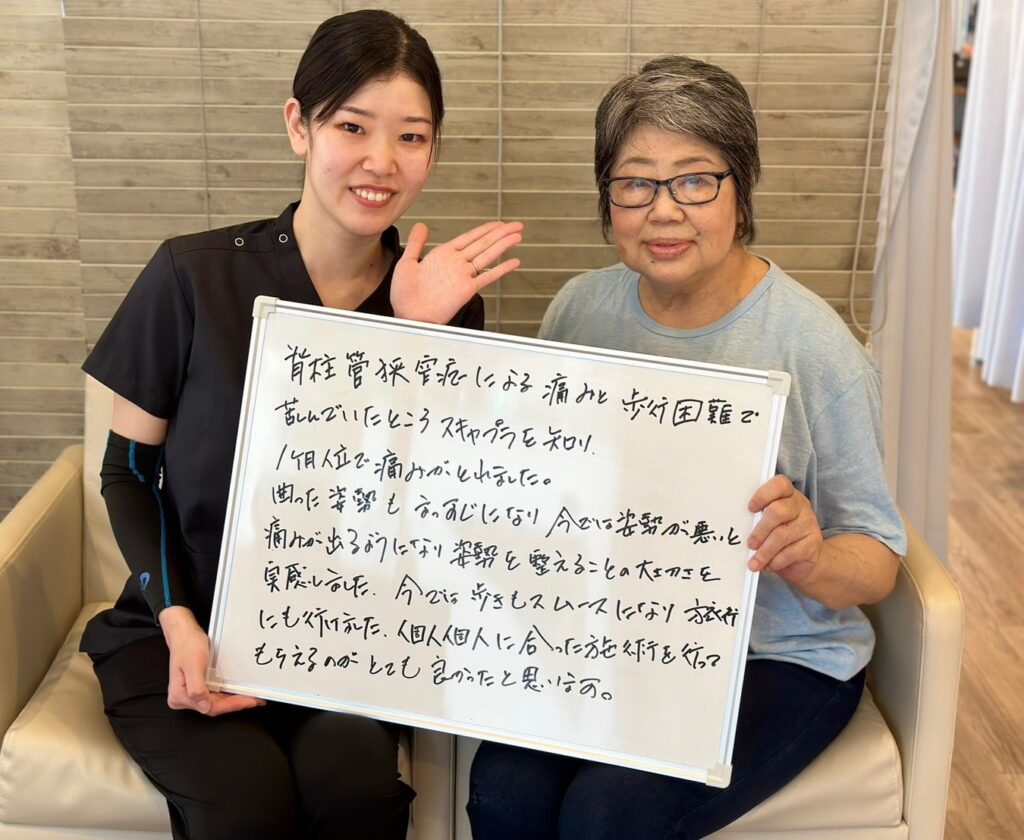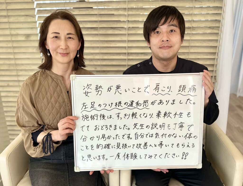 曲がった姿勢もまっすぐになり、姿勢が悪いと痛みが出ることを知り、姿勢を整えることの大切さを実感しました。
