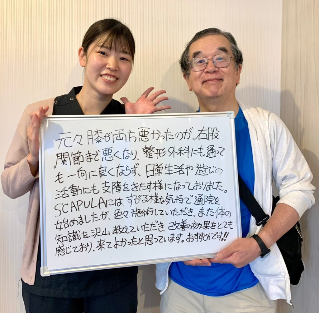 今では歩きもスムーズになり、旅行にも行けました。個人個人に合った施術を行ってもらえるのがとても良かったと思います。